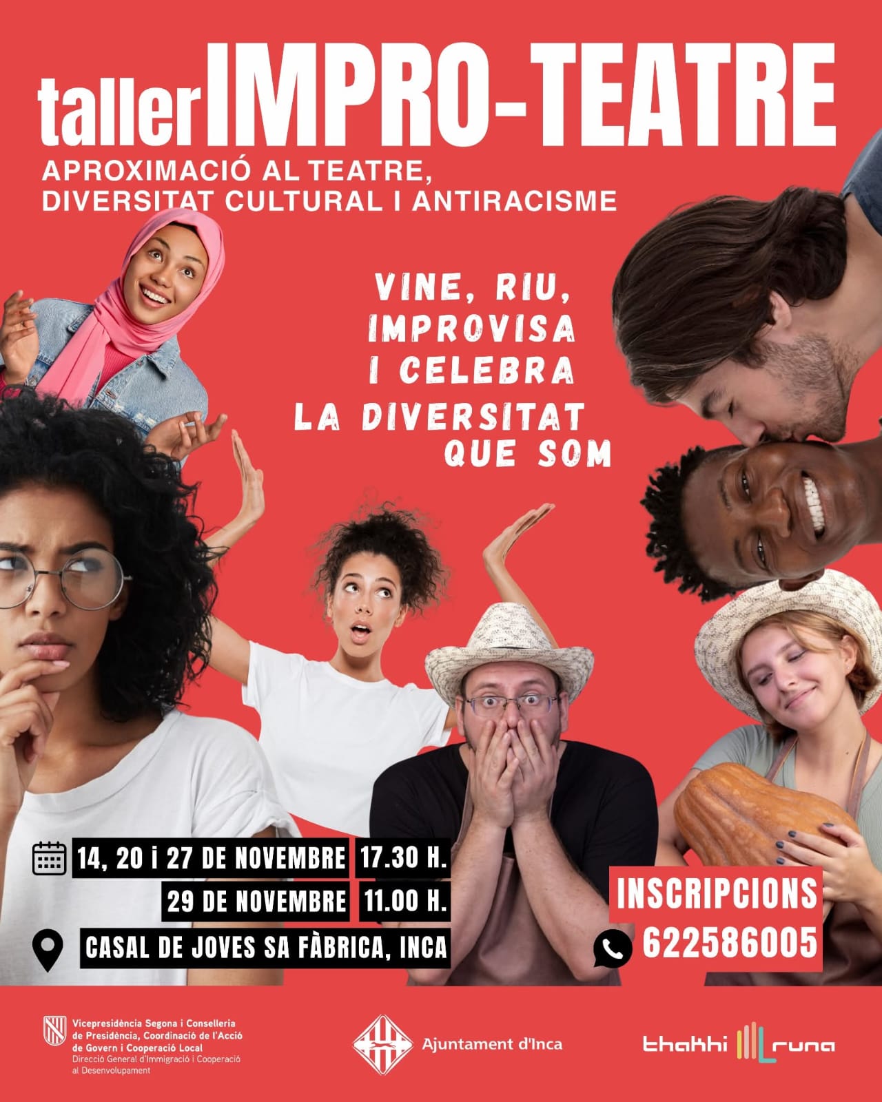 El pasado viernes tuvo lugar en el Casal de Joves un taller de aproximación al teatro, diversidad cultural y antirracismo, una actividad presentada como un espacio para reír, improvisar y celebrar la diversidad. El evento, que se repetirá los días 20, 27 y 29 de noviembre, está organizado por el Ayuntamiento de Inca y financiado con fondos de la Dirección General de Inmigración y Cooperación al Desarrollo, dependiente de la Vicepresidencia Segunda del Govern balear.