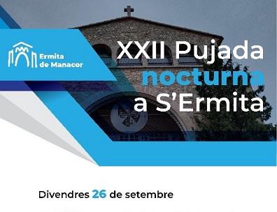 XXII Subida Nocturna a la Ermita de Manacor. Será el próximo viernes día 26 de septiembre. Lugar de concentración en la plaza Sa Torre a las 19:30 horas. Es obligatorio llevar un chaleco reflectante y una linterna. Todos y todas los que lleguen arriba serán recibidos con helado y ensaimada, para recuperar fuerzas.