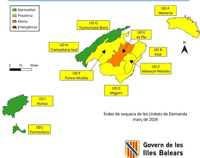Actualmente, el 29,1% del territorio —correspondiente a las unidades de demanda de Formentera, Tramuntana Nord, Tramuntana Sud y Eivissa— se encuentra en situación de normalidad, mientras que el 60,7% —Menorca, Artà, Manacor-Felanitx, Migjorn y Palma-Alcúdia— se sitúa en prealerta. Por su parte, el 10,2% del territorio, correspondiente a la unidad de demanda de es Pla, se encuentra en situación de alerta.
