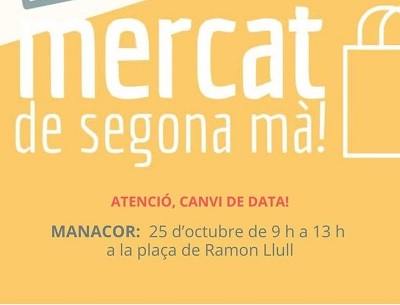 En Manacor cambio de fecha para el Mercado de 2ª Mano. Estaba previsto que se hiciese el día 11 de octubre, se cambia la fecha y se hará el sábado día 25, plaza Ramón Llull de 9 a 13 horas