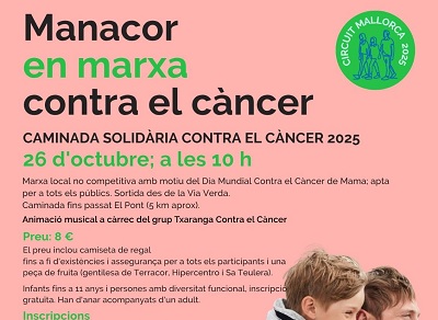 Manacor en marxa contra el Cáncer. El próximo 26 de octubre a aprtir de las 10:00 horas Caminata Solidaria. 5 kilómetros aproximadamente. Animación la Txaranga del cáncer. El precio es 8 euros y entra una camiseta y fruta. Inscripciones a partir del 9 de octubre.