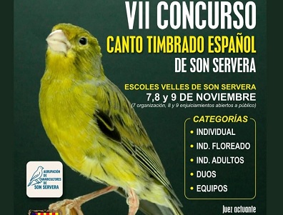 - VII Concurso Canto Timbrado Español en Son Servera en las Escuelas Viejas, 7, 8 y 9 de noviembre. Inscripciones del 15 de octubre al 3/11/2025. Agrupación de Canaricultores