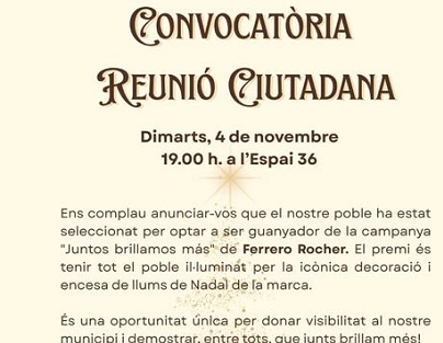 Ayuntamiento de Sant Llorenç des Cardassar. CONVOCATORIA REUNIÓN CIUDADANA. Martes, 4 de noviembre 19.00 horas en el Espai 36. Nos complace anunciaros que nuestro pueblo ha sido seleccionado para optar a ser ganador de la campaña "Juntos brillamos más" de Ferrero Rocher. El premio es tener todo el pueblo iluminado por la icónica decoración y encendido de luces de Navidad de la marca.